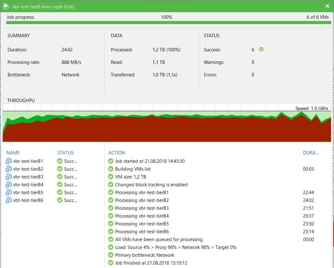Подробное описание конфигурации кластера Ceph выходит за рамки данной статьи. Отметим, что для надежности и отказоустойчивости данные на нем хранятся в трех копиях. Производительность кластера не вызывает нареканий и заложена с запасом, результаты тестов показали, что ни в одном из них хранилище бэкапов не являлось узким местом.