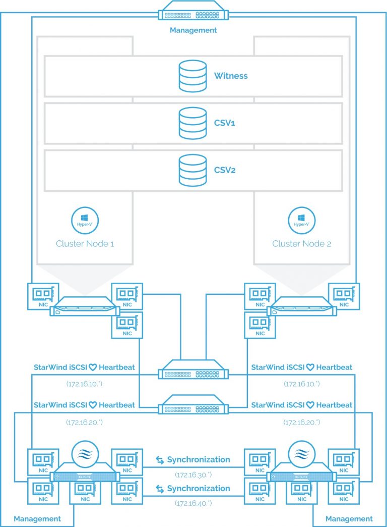 Серверные узлы хост-серверов Hyper-V объединены в Failover Cluster, что позволяет гибко масштабировать его и защититься от отказов оборудования, а узлы StarWind обеспечивают надежное хранение, при этом диски StarWind добавлены в тома CSV (Cluster Shared Volumes - на картинке это CSV1, CSV2 и Witness), что позволяет эффективно управлять хранилищами и обеспечить их надежность.