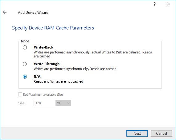 Далее определяем политику кэширования L1 (то есть в RAM, подробнее у нас тут). Вообще, StarWind рекомендует иметь 1 ГБ такого кэша на 1 ТБ сырой емкости дисков хранения: