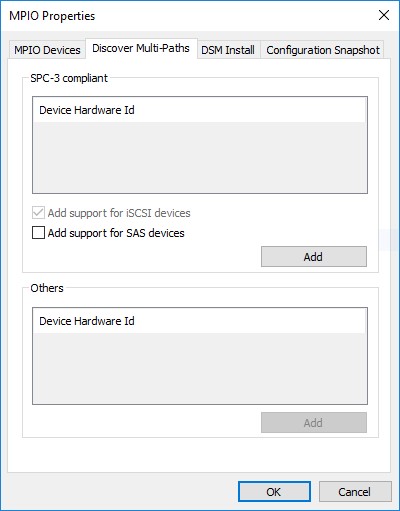 Далее нужно включить доступ по нескольким путям на узлах StarWind, для этого нужно запустить MPIO manager: Start->Administrative Tools>MPIO. Далее идем в Discover Multi-Path, ставим галку Add support for iSCSI device и нажимаем Add, после чего перезагружаем сервер.