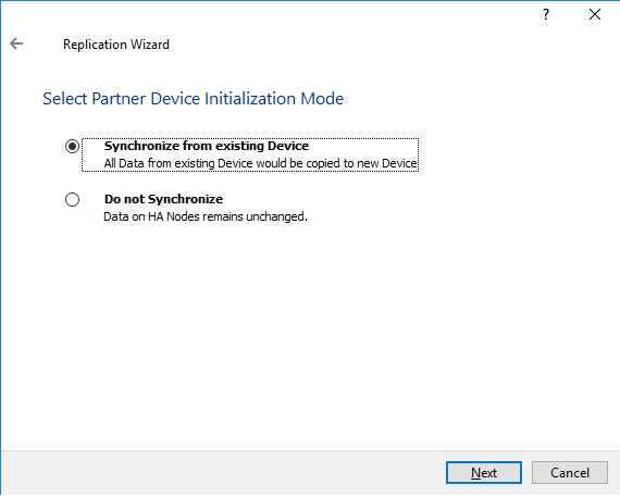 Далее выбираем режим синхронизации с уже существующим HA-устройством (Synchronize from existing Device):