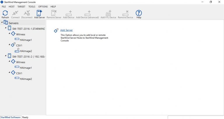 Если консоль установлена там же, где и основной сервис StarWind, то этот сервер будет сразу же добавлен, если же консоль размещена на отдельном сервере - нужно будет добавить оба узла StarWind, нажав на иконку Add Server.