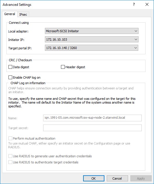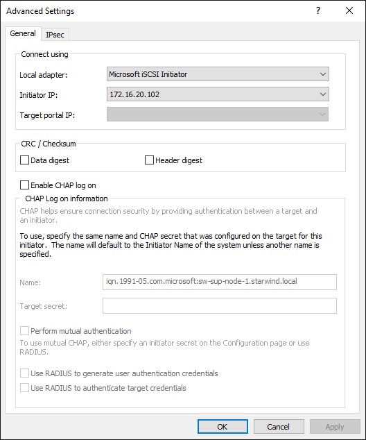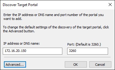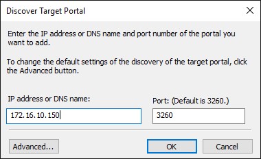 Тут выбираем Microsoft iSCSI Initiator как Local adapter и выбираем IP-адрес первого узла серверного кластера из той же подсети.