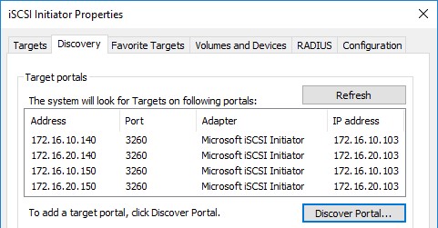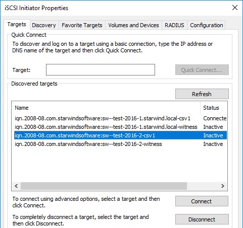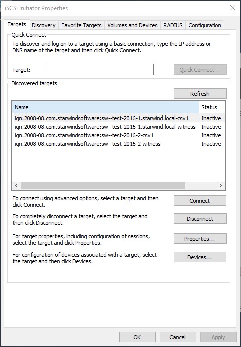 После того, как таргеты были добавлены, нам надо соединиться с ними. Для этого запускаем Microsoft iSCSI Initiator на первом вычислительном узле Hyper-V и переходим на вкладку Targets. Созданные таргеты должны быть в разделе Discovered Targets (4 штуки в нашем случае).