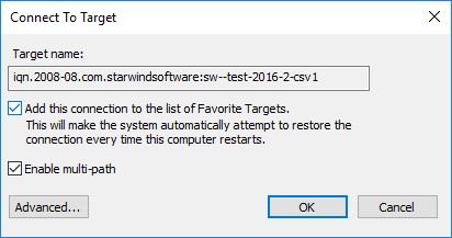 Нажимаем кнопку Connect для таргета iSCSI и отмечаем оба предложенных чекбокса:
