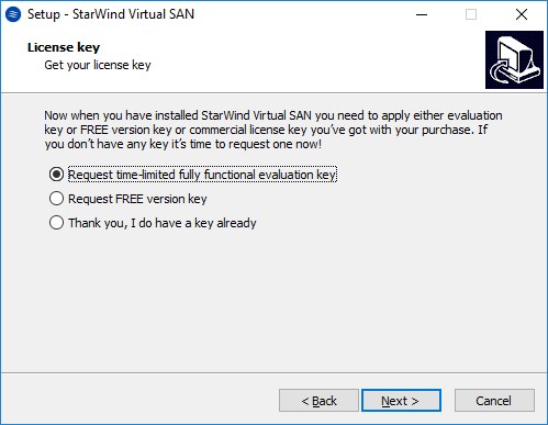 В процессе установки можно запросить полнофункциональный бесплатный ключ, который позволит в течение пробного периода использовать все возможности StarWind Virtual SAN: