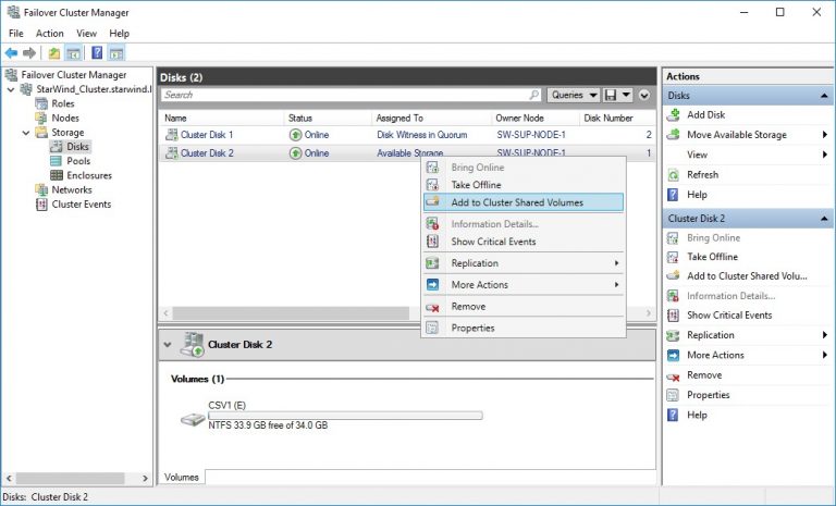 Нажимаем правой кнопкой на диске и выбираем пункт Add to Cluster Shared Volumes.