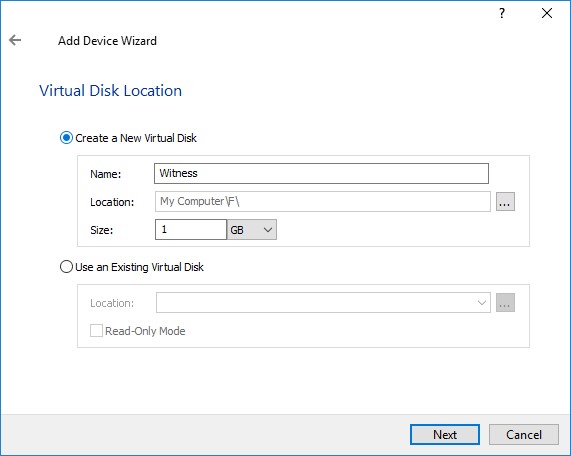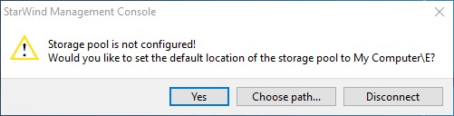 Затем нажмите на иконку Add Device, и далее StarWind попросит вас создать новый пул хранения (сначала сделаем это для хранилища Witness, а для томов CSV1 и CSV2 процедура выглядит полностью аналогично):