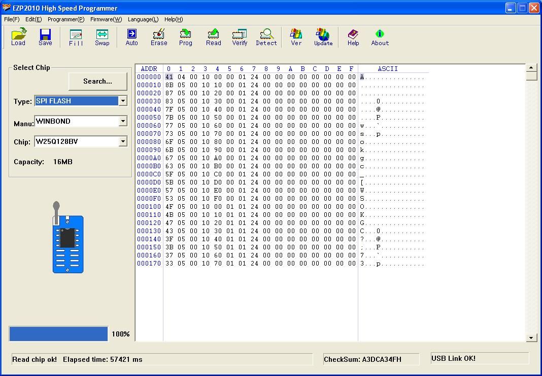 С помощью программы снимаем дамп чипа. У меня программа ругалась, что не понимает эту микросхему, но образ считала без проблем. Как выяснилось, мой программатор позволяет считать только 16Mb, а чип 32Mb. Но посмотрев в конец дампа заметил, что там одни FF, сделал предположение, что ничего там дальше нету. К тому же файл прошивки c сайта Dell тоже имеет размер 16Mb.