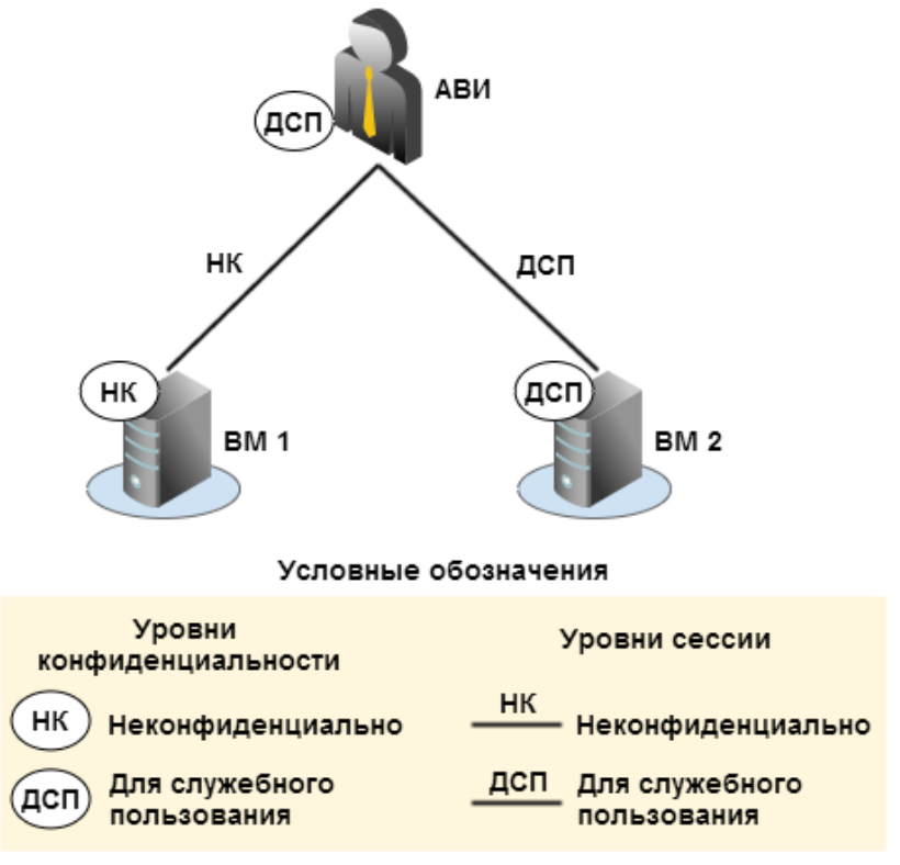 Каждый сеанс работы пользователя при подключении к защищенной среде получает уровень сессии, равный уровню конфиденциальности, который назначен пользователю. При этом пользователь может выполнять операции с ресурсами того же или меньшего уровня конфиденциальности.