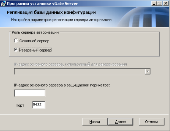 Устанавливается резервный сервер авторизации vGate R2 очень просто - нужно запустить установщик на той машине, которая будет резервной и указать IP-адрес основного сервера, а также порт для канала репликации данных: