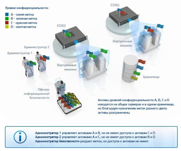 Отдельной сущностью у нас идет администратор VMware vSphere (то есть тот, кто через vSphere Client управляет виртуальной инфраструктурой). Его учетной записи назначается определенная метка конфиденциальности (т.е., по-сути, это его уровень допуска к информации в виртуальной инфраструктуре). А при выполнении ряда стандартных операций с объектами виртуальной инфраструктуры осуществляется сравнение меток конфиденциальности ресурсов и учетных записей администраторов.
