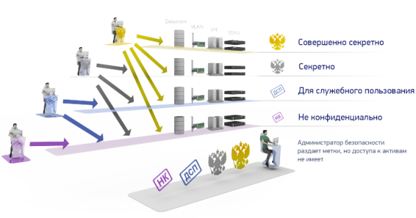В данном случае у на есть 3 "домена безопасности" - это секретно, ДСП и неконфиденциально, и 3 пользователя, каждый из которых может работать только со своим типом ресурсов, которые могут быть расположены даже на одном хост-сервере VMware ESX / ESXi. Соответственно ресурсы между собой взаимодействуют тоже в рамках своего уровня (или ниже, если задано в доп. настройках).