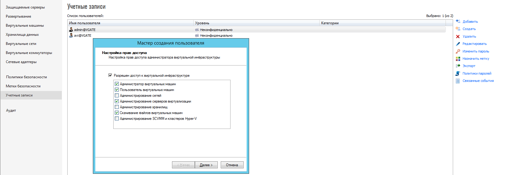 Для быстрой настройки привилегий пользователя реализована ролевая модель доступа. При создании учетной записи можно предоставить доступ, например, только к виртуальным машинам или сетевым объектам, что очень удобно: