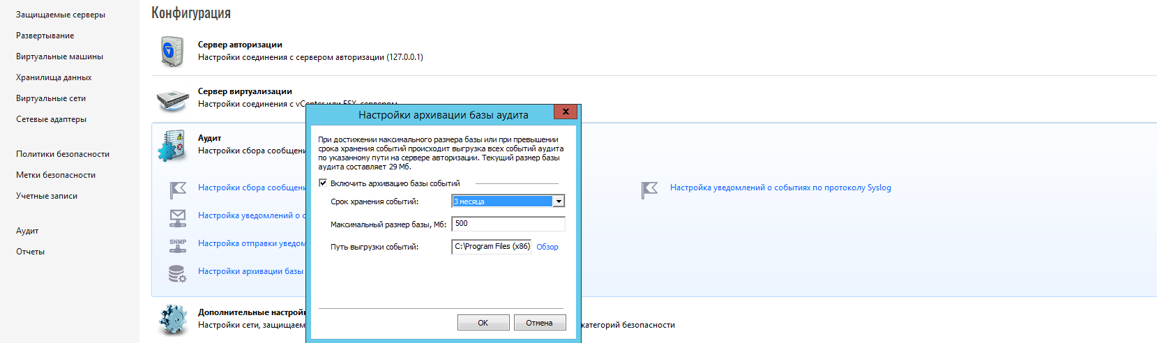 Реализован механизм настройки архивации и автоматической выгрузки базы событий аудита.