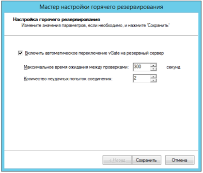 В vGate R2 реализована возможность горячего резервирования сервера авторизации vGate R2 (HA-кластер). В случае потери работоспособности основного сервера происходит переключение на резервный, замена IP-адреса и оповещение администратора в автоматическом режиме: