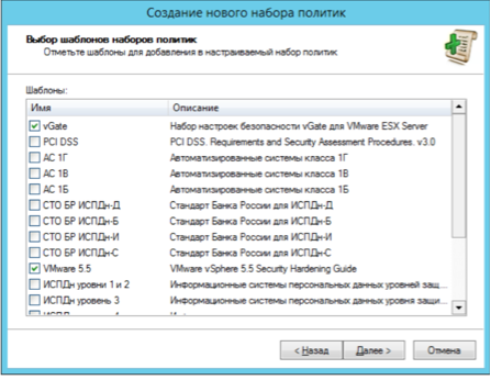 В vGate R2 версии 3.0 обновлены наборы политик безопасности по соответствию приказам ФСТЭК России №17 и №21, стандартам СТО БР ИББС, PCI DSS и других, что позволит упростить процесс приведения инфраструктуры виртуализации в соответствие требованиям регуляторов. Добавлены обновленные политики VMware Hardening Guide vSphere 6.
