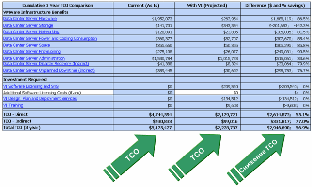 Мы здесь видим два показателя TCO (с VMware и без VMware), а также сумму снижения затрат за три года в долларах и в процентах. Два основных вывода, которых мы можем сделать при анализе TCO:
