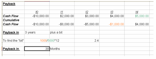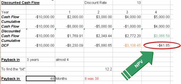 Здесь прекрасно просматривается движение денежных средств по проекту (здесь он длится 4 года). Колонка Cash flow показывает нам приход-расход денежных средств. Сначала мы вложили $10 000 (год 0), а потом получаем прибыль от виртуальной инфраструктуры ($2K, $3K, $4K и $5K соответственно в каждый год). В колонке Cumulative Cash Flow мы четко видим баланс нашей инвестиции, а в колонке Discounted Cash Flow - "правильную" оценку стоимости возвращаемых от инвестиции денег (с учетом "инфляции" в 13%). Дальше очень просто - в колонке CumulativeDiscounted Cash Flow совокупный дисконтированный баланс по инвестиции с учетом удешевления Стоимости денег, описанной в прошлом пункте.