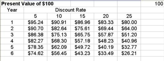 Или, если сказать другими словами и с другой стороны, если сейчас потратить $26 на инвестиции, то это будет адекватно $100, возвращенным через 6 лет при ставке в 25%. Само собой, такая ставка является явно завышенной. При реальных расчетах можно брать величину ставки в 5-15%, что будет соответствовать альтернативе, представляющей собой внесение денег в банк и извлечение прибыли.