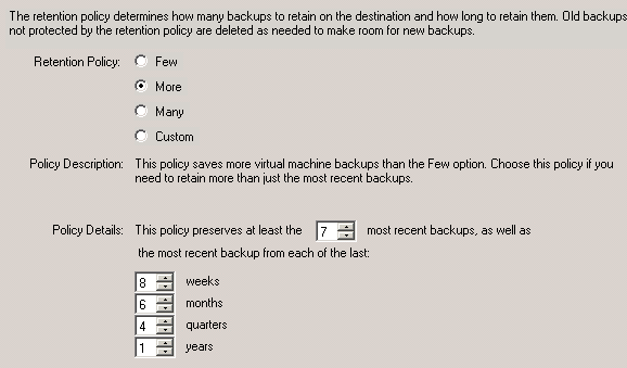 Здесь есть 3 предопределенных политики, а также возможность задать сколько бэкапов хранить (most recent backups) и через какое время их делать (from each of the last).