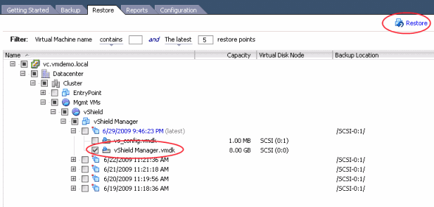 Восстановление же виртуальной машины через VMware Data Recovery никаких проблем не вызывает - достаточно просто выбрать виртуальный диск или виртуальную машину целиком и нажать кнопку Restore: