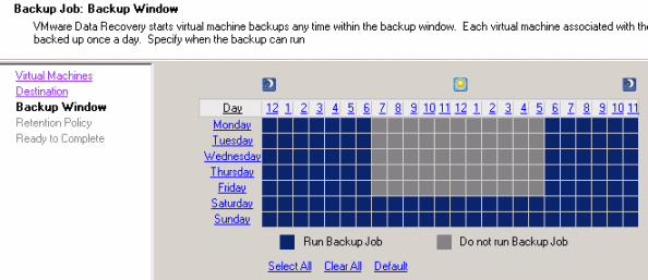 Дефолтное окно резервного копирования не включает в себя типичные бизнес-часы. При запуске задач на основе выбранных окон, VMware Data Recovery будет руководствоваться следующими принципами: