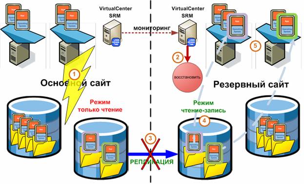Простои в случае катастрофы к 0, естественно, не сводятся, но сокращаются в разы, или даже в десятки раз. Безусловно, имея резервные копии всех виртуальных машин, можно восстановить виртуальную инфраструктуру на другом оборудовании, но, во-первых, это займет значительно больше времени, а, во-вторых, обеспечит некоторую потерю данных.