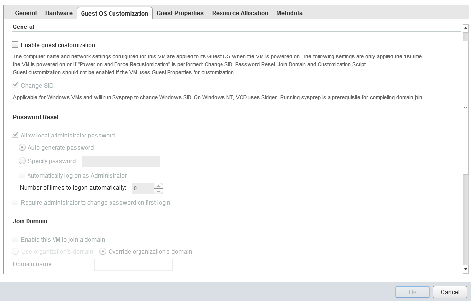 Прежде чем начать замену адаптера, следует убедиться еще кое в чем. Например, проверить, что не активирован механизм Guest customization. Отключить эту опцию можно в свойствах виртуальной машины, перейдя в закладку Guest OS Customization консоли vCloud Director.