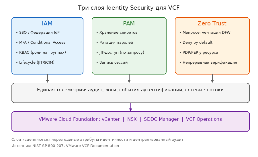 Итоговая цель — замкнутая петля безопасности: IdP и RBAC определяют доступ, PAM контролирует привилегии, NSX/DFW обеспечивает enforcement у ресурса, а VCF Operations обеспечивает непрерывную проверку и расследуемость.