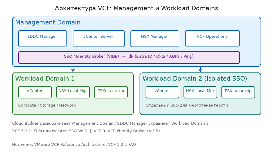 В VCF 5.2.1 были предусмотрены три варианта SSO: общий домен через Enhanced Link Mode (ELM), изолированные SSO Workload Domains для многотенантности и федерация с внешними провайдерами идентификации (Identity Providers). Через VCF Operations можно централизованно включить federated SSO на всех vCenter и NSX Local Managers.