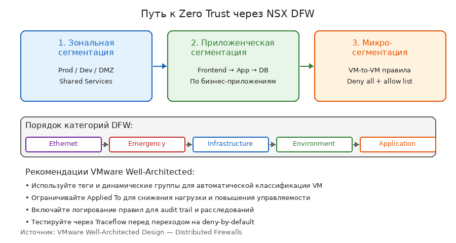 Начать с зональной сегментации (Prod/Dev/Shared Services), затем перейти к приложениям и микросегментации. Этот путь описан в Well-Architected DFW.