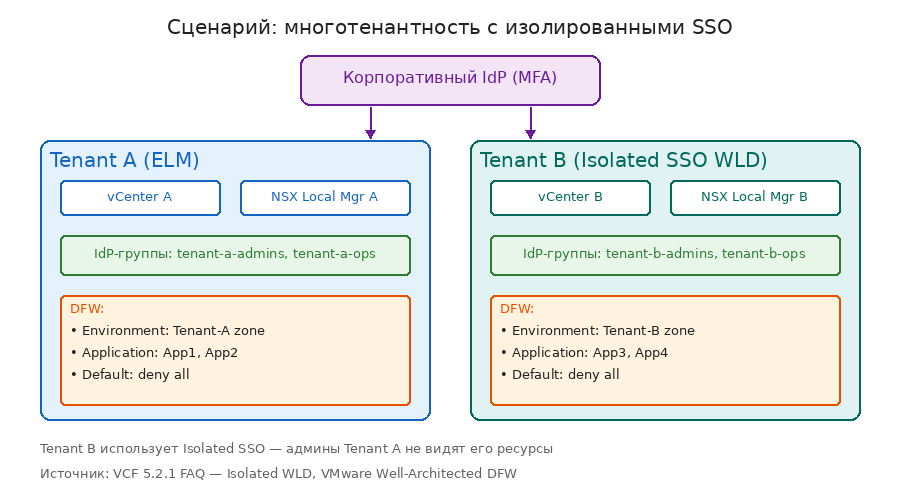 В VCF можно комбинировать Enhanced Link Mode для одних доменов и Isolated SSO Workload Domains для других — чтобы разделить управление между арендаторами. VCF FAQ описывает Isolated WLD и возможность централизованного включения federated SSO. Ключевые моменты: разные IdP-группы для разных доменов, микросегментация DFW по зонам (Environment) и приложениям (Application), один админ не может «видеть всё».