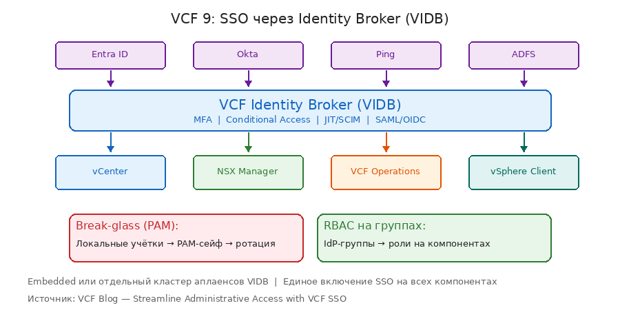 VCF 9 Identity Broker обеспечивает единый SSO для всех консолей управления с поддержкой Entra ID, Okta, Ping и generic SAML. Правила: MFA обязательна на уровне IdP, локальные логины запрещены вне break-glass, роли только на группах, привилегированные сессии — только через PAM-прокси с записью.