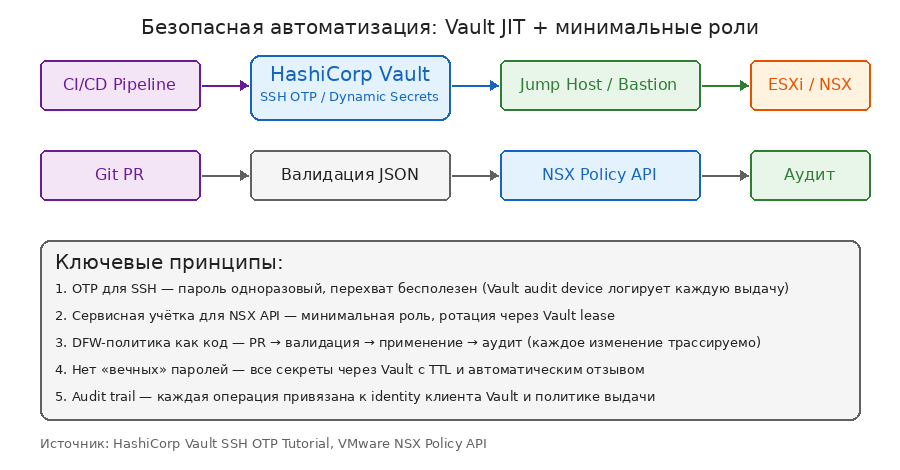 Пайплайны и CI/CD-роботы не хранят «вечных» паролей. SSH-доступ к jump-хостам — через одноразовые пароли Vault. Политика DFW применяется как код: PR > валидация JSON/YAML > применение через NSX API с минимальной сервисной ролью > запись в аудит.
