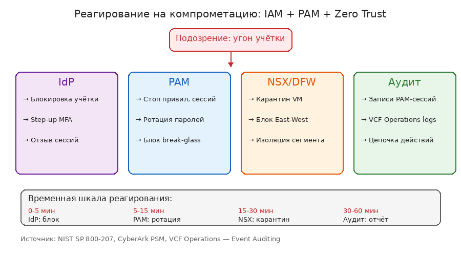 Если подозревается компрометация административной учётной записи, связка IAM+PAM+Zero Trust позволяет быстро ограничить ущерб: