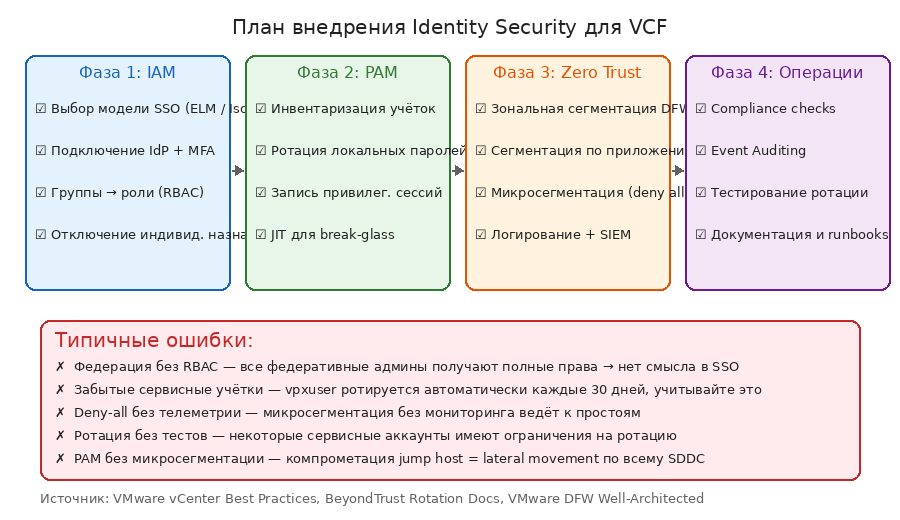 Identity Security в VMware Cloud Foundation - это не три отдельных проекта, а единая архитектурная дисциплина. IAM убирает анонимность и привязывает каждое действие к конкретной идентичности через федерацию и MFA. PAM закрывает неизбежные локальные и сервисные учётки - ротация, JIT-доступ и запись сессий превращают «вечный пароль» из постоянного риска в контролируемый инструмент. NSX DFW доводит принцип Zero Trust до уровня каждой ВМ - даже если учётка скомпрометирована, lateral movement упирается в микросегментацию. Связка работает: IdP определяет «кто», RBAC - «что можно», PAM контролирует «как именно», а DFW обеспечивает enforcement там, где находится ресурс.