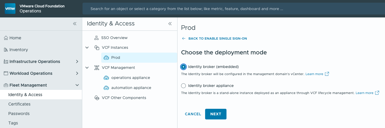 VMware Cloud Foundation 9 вводит новую консоль управления – VCF Operations, через которую осуществляется настройка всех сервисов, в том числе и единого SSO. Начальный шаг для организации единого входа – развертывание брокера идентификации (VCF Identity Broker, VIDB) и подключение каталога пользователей. Cloud Foundation позволяет выполнить это в одном из двух режимов: