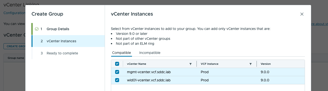 Далее нажмите Create Group и запустите мастер настройки. В мастере достаточно выбрать из списка те vCenter Server, которые вы хотите связать воедино. Все vCenter, добавляемые в одну группу, должны использовать общий провайдер идентификации (Identity Broker), настроенный на предыдущем этапе. Иными словами, они уже должны быть подключены к VCF SSO – в противном случае консоль попросту не позволит их сгруппировать.