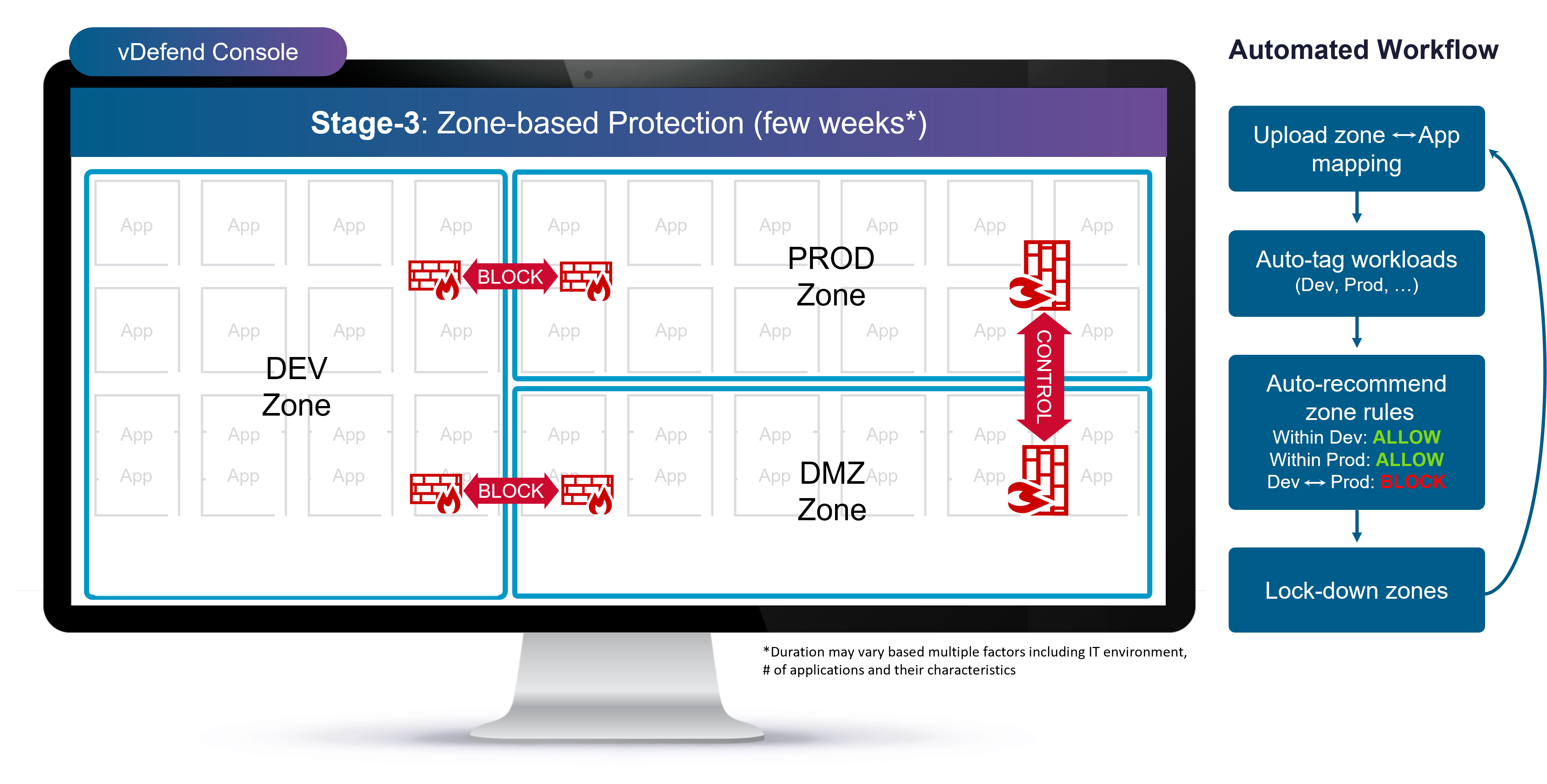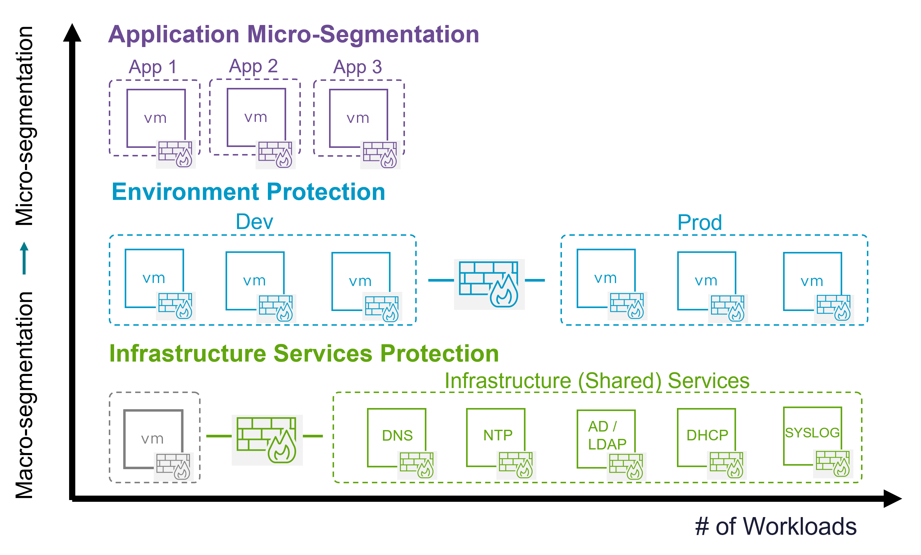 После того как инфраструктурные (общие) сервисы защищены, пользователи могут перейти к определению границ среды (зон) — например, Development и Production. Пользователи могут импортировать эти метаданные с помощью CSV-файла. Система поддерживает CSV-файлы, экспортированные из CMDB-систем (например, ServiceNow) или даже из vCenter, либо пользователи могут создать CSV-файл по простому шаблону таблицы, предоставляемому DFW 1-2-3-4. Платформа назначает этим рабочим нагрузкам теги безопасности, проверяет взаимосвязи и предоставляет стандартные правила на уровне окружений через DFW, тогда как сегментация зон для существующих рабочих нагрузок с использованием традиционных межсетевых экранов требует сложной работы с сетями и IP-адресами.