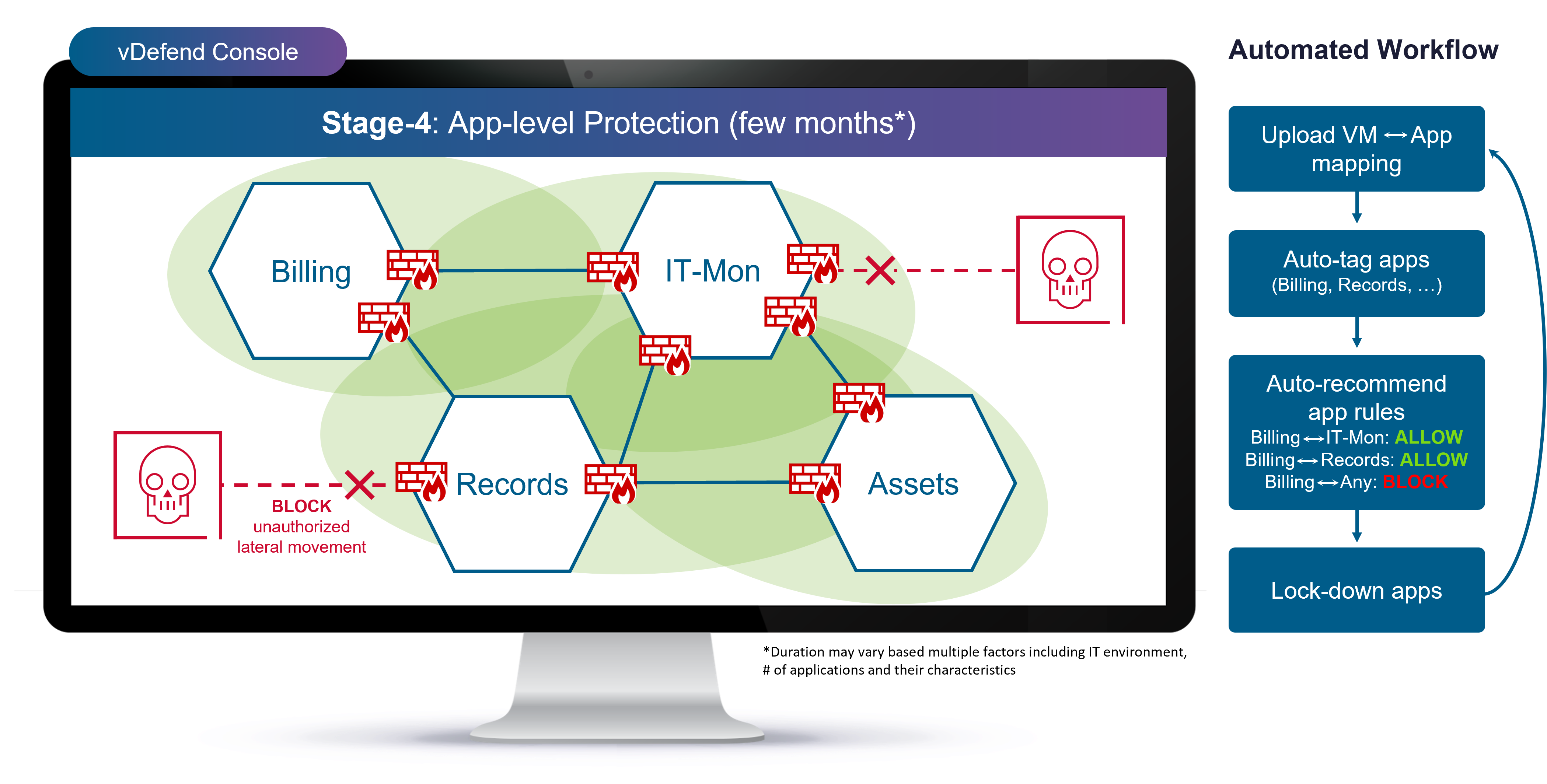 При развертывании Zero Trust для быстрого устранения пробелов в безопасности и улучшения сегментации в существующей (brownfield) или новой (greenfield) среде, клиентам нужен предписывающий многоэтапный рабочий процесс сегментации, разработанный для постепенной защиты восточно-западного трафика в частном облаке VMware Cloud Foundation (VCF). vDefend предоставляет Distributed Firewall (DFW) 1-2-3-4 — автоматизированный рабочий процесс, который помогает администраторам безопасности системно укреплять защиту частного облака.