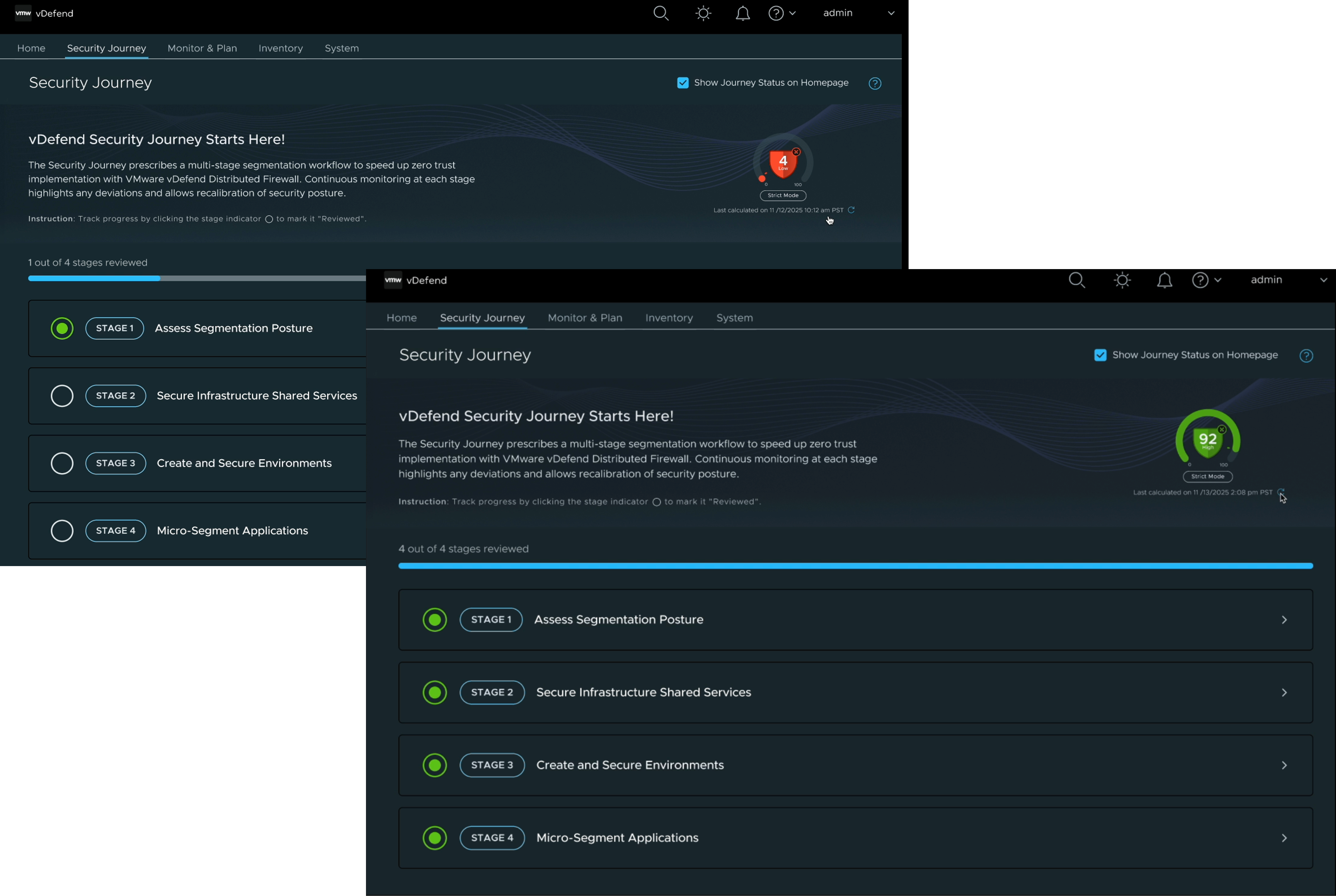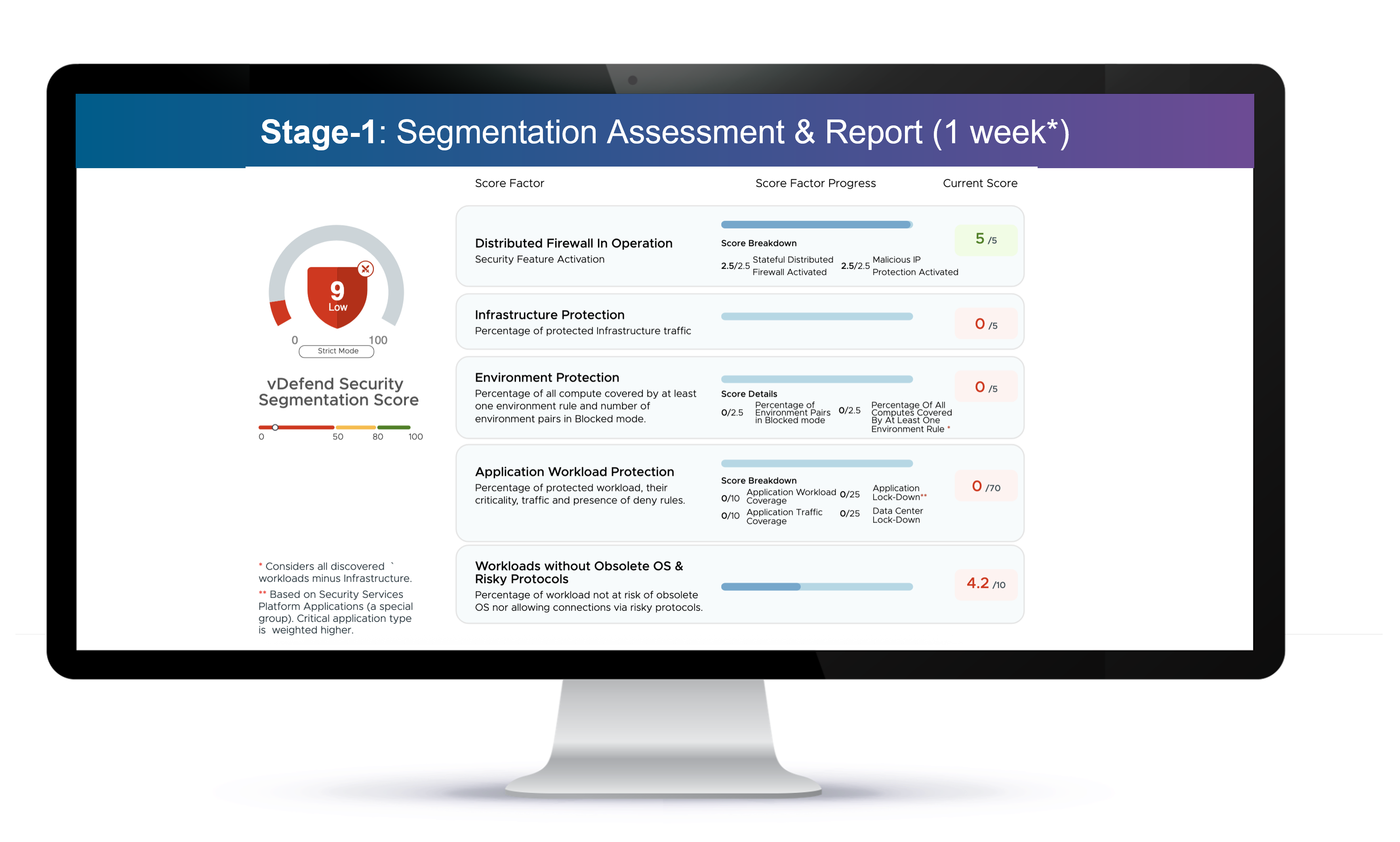 По мере завершения каждого этапа клиенты могут генерировать отчёт по сегментации безопасности, чтобы оценить свой текущий показатель сегментации. Этот показатель автоматически пересчитывается при любых изменениях в среде, обеспечивая постоянную обратную связь и помогая отслеживать прогресс со временем. Такая видимость позволяет командам демонстрировать измеримый прогресс на пути к Zero Trust и ясно представлять результаты руководству и аудиторам.