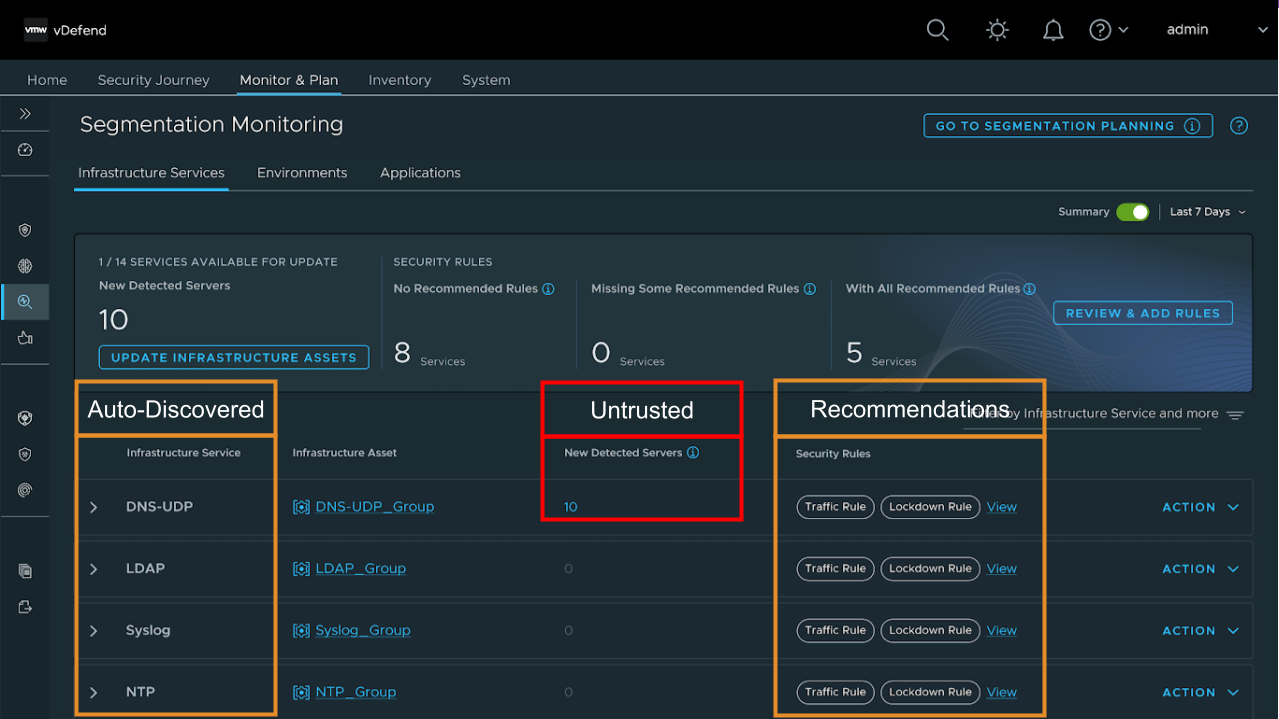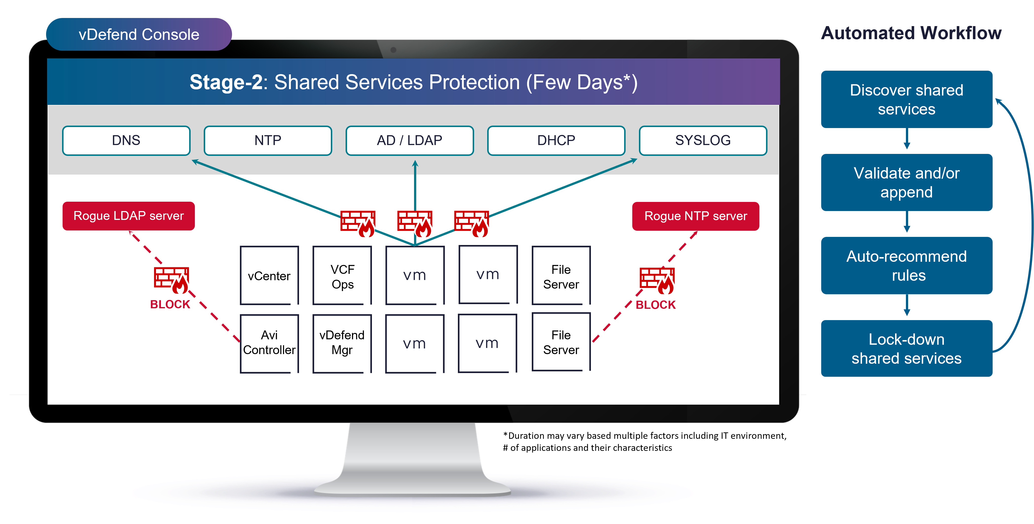 Начните с базового слоя вашего датацентра — общих сервисов, таких как DNS, NTP, Syslog, SNMP, DHCP и LDAP/LDAPs. DFW 1-2-3-4 автоматически обнаруживает инфраструктурные сервисы, определяет их эндпоинты и позволяет пользователю проверить и автоматически создать правила защиты для этих сервисов. Пользователи также могут загрузить известные эндпоинты инфраструктурных сервисов через CSV-файл, чтобы система добавила их автоматически. Этот этап обеспечивает быстрый рост уровня безопасности при минимальных изменениях — идеальный простой способ для команд, начинающих путь к Zero Trust. Ограничение доступа к этим сервисам, особенно к DNS-серверам, позволяет устранить наиболее часто используемые каналы Command & Control (C&C) и пути эксфильтрации данных, которыми пользуются злоумышленники.