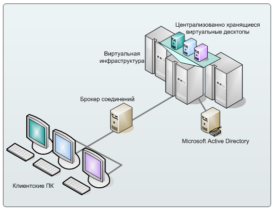 • VMware Virtual Desktop Manager – брокер соединений (connection broker), стоящий на выделенном сервере со статическим IP и «разруливающий» обращения клиентов к своим десктопам.