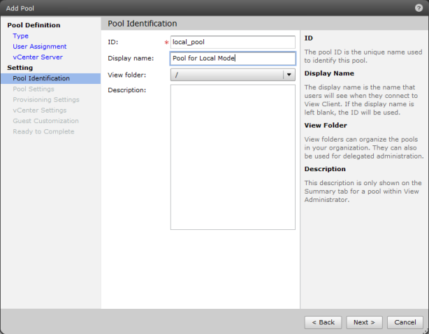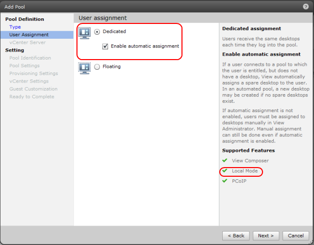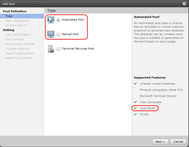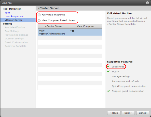 Нужно обратить внимание, что справа показано какие возможности поддерживает создаваемый пул виртуальных ПК. В списке Supported Features должна присутствовать возможность Local Mode.