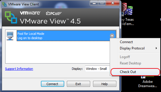 По окончанию процесса, для тестирования, можно отключить соединение рабочей станции с сервером VMware View Manager. Клиент View определит, что соединения нет и определит десктоп как локальный: