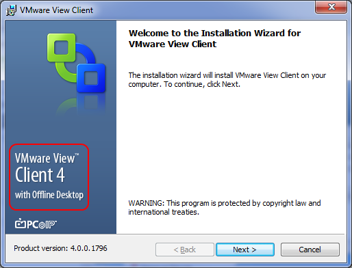 Затем на рабочей станции, где будет использоваться автономный виртуальный ПК нужно установить VMware View Client with Local Mode (этот клиент отличается от стандартного VMware View Cllient, поскольку содержит измененную версию VMware Workstation для запуска виртуального ПК локально). Для версии VMware View 4.5 это файл VMware-viewclientwithoffline-4.0.0-210939.exe.