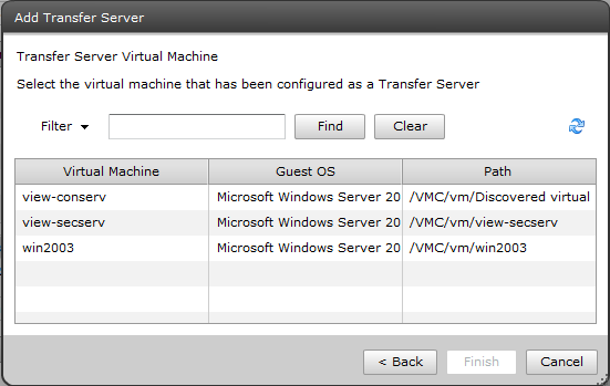 Здесь нужно выбрать Transfer Server из списка виртуальных машин на VMware vCenter и нажать Finish: