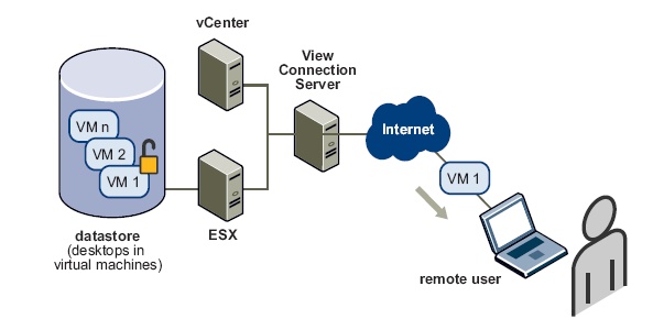 Удаленный пользователь запускает View Client с Offline Desktop и получает список десктопов, которые он имеет право использовать. Пользователь выбирает совместимый Offline Desktop, начинает процесс загрузки, после которого виртуальная машина закачивается на клиентскую станцию.