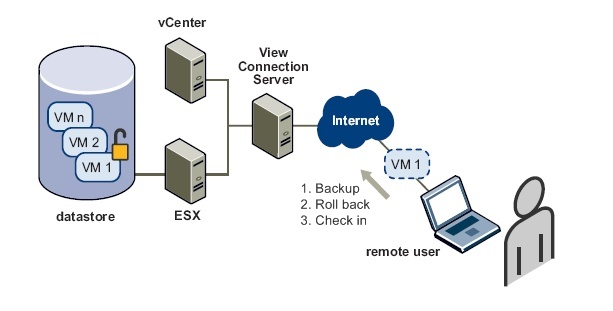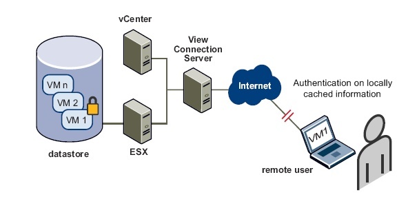 Offline Desktop предоставляет возможность мобильным пользователям выгрузить (check out) себе гостевую ОС из пула VMware View Manager и после закачивания ОС себе локально, например, на ноутбук, пользователь может работать с данной копией ОС как в режиме подключения к View Manager, так и при отсутствии сети, т.е. offline. Такая особенность работы предоставляет сразу несколько преимуществ по сравнению со стандартными онлайн решениями.